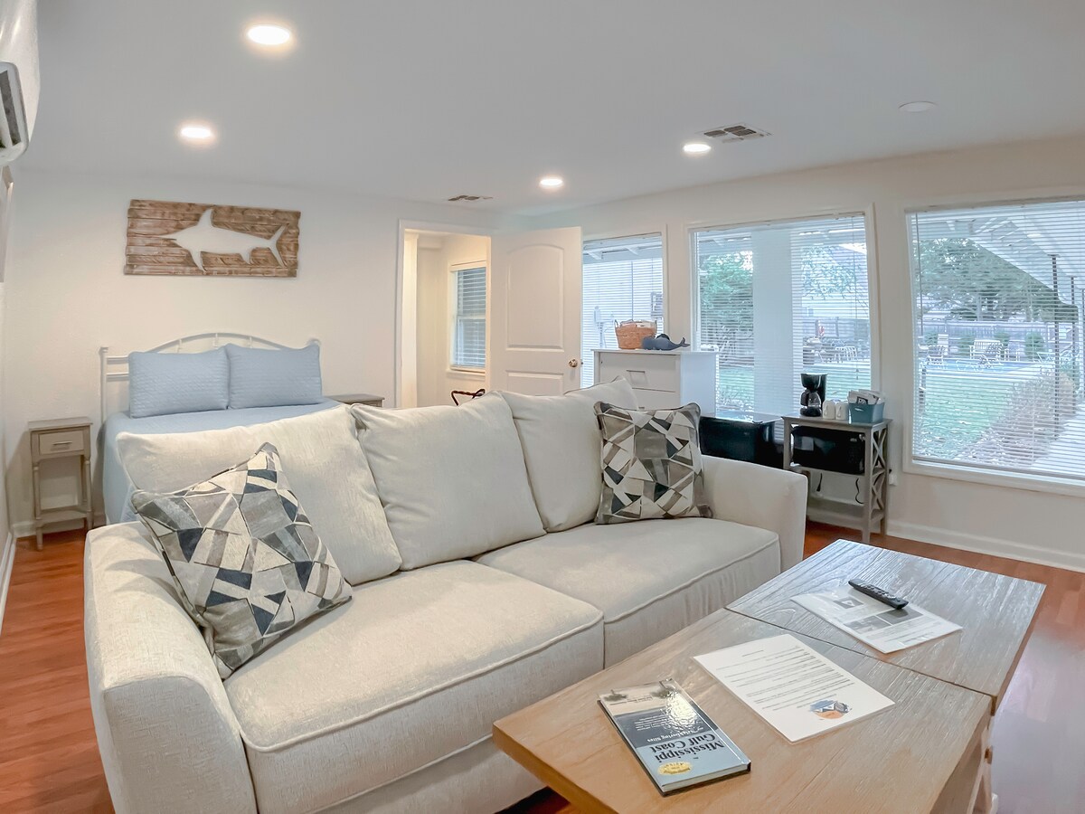 Das Mindestalter für den Check-in beträgt 21 Jahre. Die State Street Suites befinden sich im Herzen der Altstadt von Bay St. Louis und nur wenige Schritte vom Strand an der 109 State Street. Diese Einheit verfügt über zwei private Schlafzimmer (ein Kingsize-Bett und ein Queensize-Bett), ein komplettes Badezimmer, eine voll ausgestattete Küche sowie ein großes Wohnzimmer mit einem Queensize-Schlafsofa. Sie teilt sich einen langen Balkon mit ihrer Schwestereinheit zum Sternegucken und Plaudern und ist umgeben von Geschäften, Boutiquen und etwa 23 Restaurants und Bars! Es gibt zwei eigene überdachte Parkplätze.
