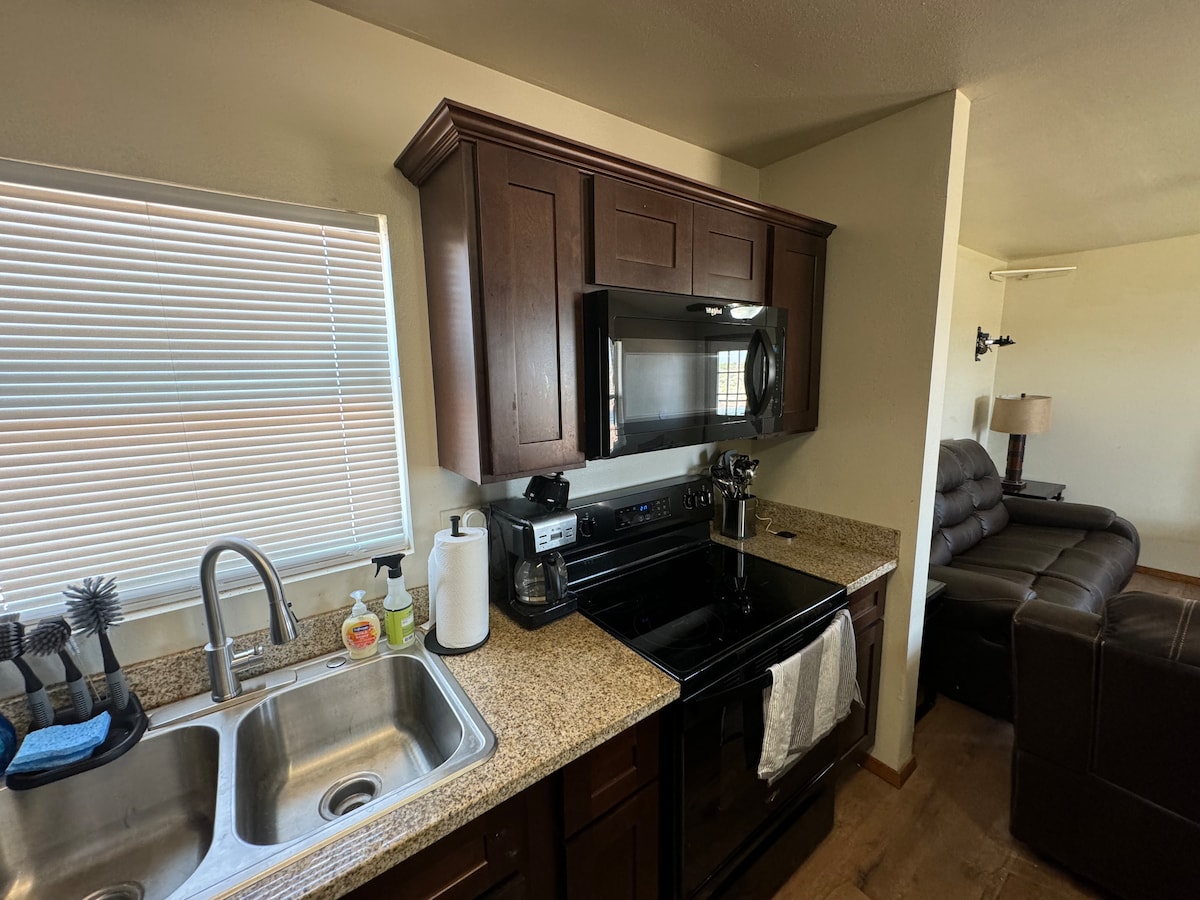 Kürzlich renoviertes älteres Steinhaus in Colorado City. Komfortable Qualitätsmöbel & Dekor bringen den Komfort von zu Hause in dein „Zuhause weg von Zuhause“! Originale und restaurierte rustikale Harthölzer, Zierleisten und Fenster sowie originale Türen bringen den Charme und Charakter dieses Hauses zum Ausdruck, während die umgebaute Küche mit Granit-Arbeitsplatten, Bauernspüle und Edelstahlgeräten moderne Annehmlichkeiten bietet! Die Schlafzimmer verfügen über luxuriöse Bettwäsche und 50-Zoll-Fernseher. Beide Schlafzimmer verfügen über Kingsize-Betten. Queen Air Matratze. KOSTENLOSER 24/7 ZUGANG ZUM FITNESSSTUDIO!