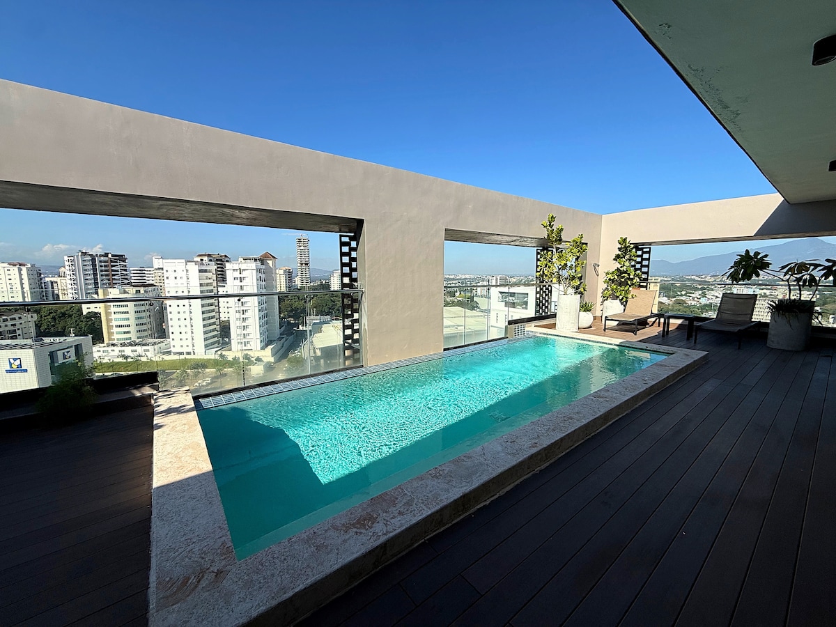 Disfruta de la sencillez de este alojamiento, tranquilo,comodo,céntrico y seguro con vista al monumento de Santiago. ubicado en un residencial cerrado con seguridad 24/7 camara de vigilancia y personal físico. garantizando seguridad y tranquilidad. (Los lunes la piscina no está disponible por mantenimiento ).
