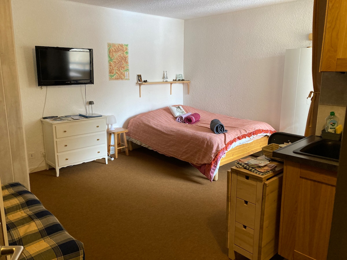 Studio "esprit chalet" idéalement situé, au pied des pistes, départs ski de fond, randonnées, raquettes. Résidence avec ascenseur, parking gratuit, casier à skis. Sur place, billetterie, magasins location matériel, garderie, école de ski, restaurant, navette gratuite(seulement en hiver), navette gare. Se compose : coin montagne (2 lits superposés), séjour avec 1 clic-clac convertible 2 places, cuisine équipée, une TV, un balcon donnant sur les pistes, salle de bain (baignoire), WC indépendant.