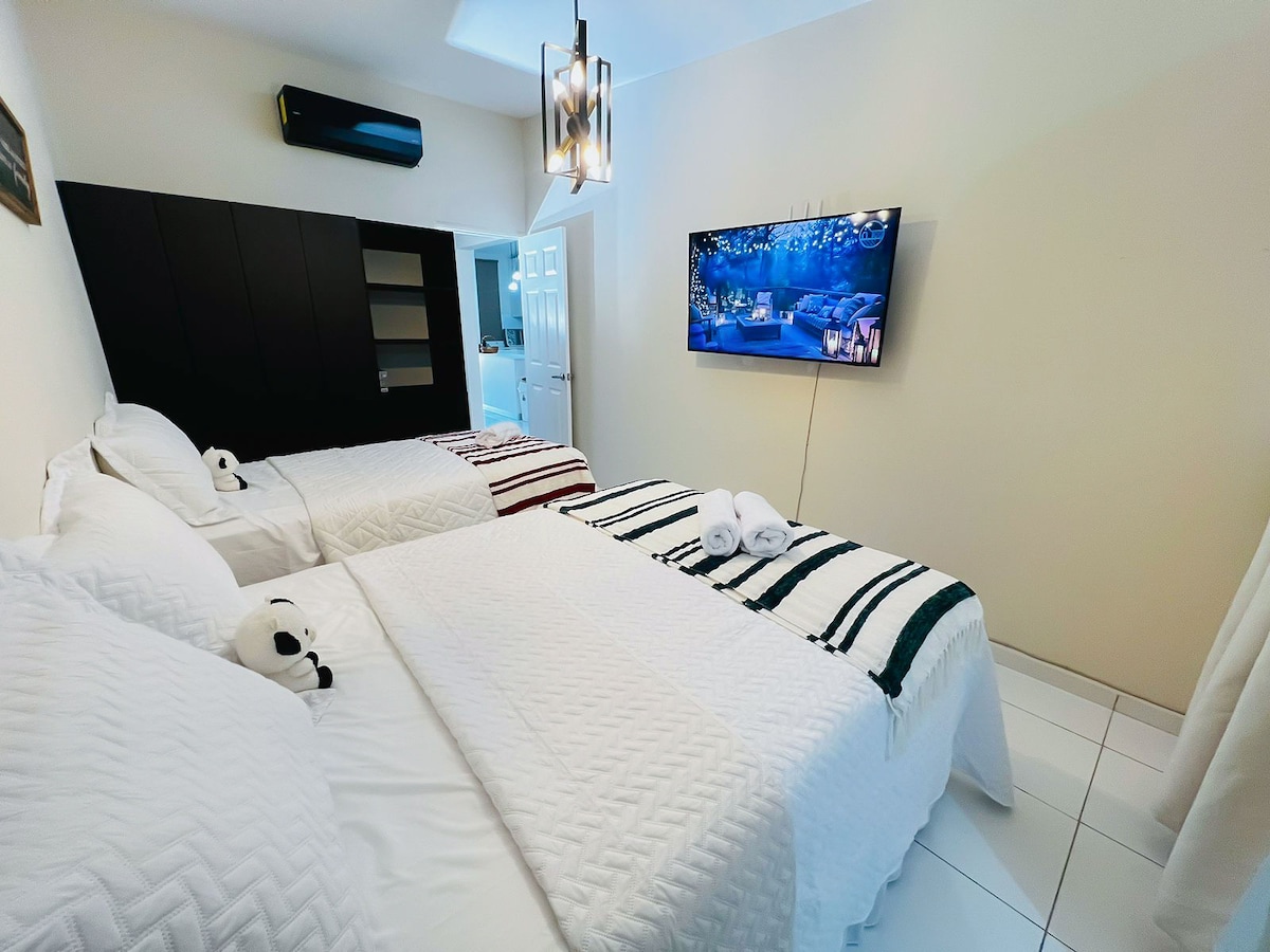 Genieße deinen komfortablen Urlaub in einer gemütlichen, modernen, ruhigen Unterkunft in einer sehr sicheren Gegend mit 24-Stunden-Sicherheitsdienst. Eigenständiger Check-in. Vorderer Pool. Das Haus verfügt über 3 Schlafzimmer mit jeweils Klimaanlage, Klimaanlage im Wohnzimmer, Hauptschlafzimmer mit Kingsize-Bett und Badezimmer, Zimmer mit Queensize-Bett, Zimmer mit zwei Einzelbetten, ein zweites komplettes Badezimmer, ein halbes Badezimmer im ersten Stock. Ausgestattete Küche, Waschmaschine , Trockner. Das Hotel liegt fünf Minuten vom Einkaufszentrum Encuentro El Sitio, zwei Minuten von Pricemart entfernt.