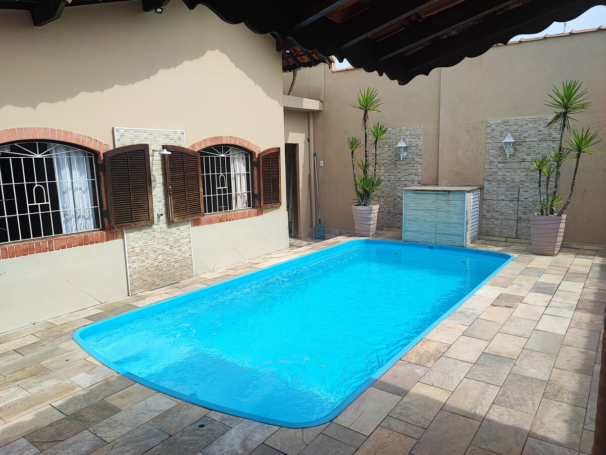 Linda Casa em Mongaguá, a 90 metros da praia. Excelente espaço externo com piscina, churrasqueira/forno e fogão a lenha para fazer aquele churrasco ou aquela comida com muita diversão na beira da piscina. Sala de estar com Mesa de sinuca e tampão de ping pong. Internet WI-FI NETFLIX Sistema de alarme Total de 3 quartos (sendo 4 camas de solteiro e 2 de casal, com mais 7 colchoes a parte). Casa conta com 3 banheiros no total. Casa terreá, excelente para pessoa com mobilidade reduzida.
