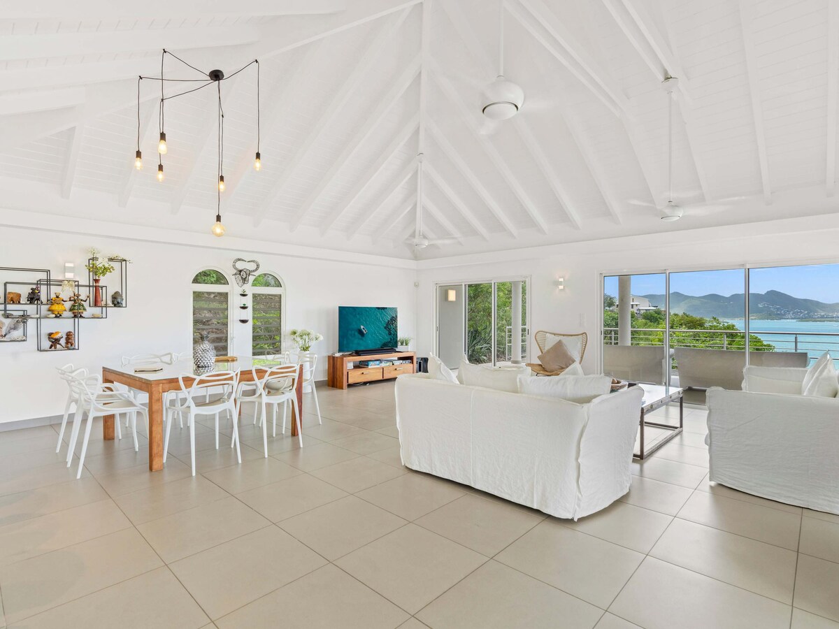 Villa Imagine – Elegant Hillside Serenity in Terres Basses Tucked away in the exclusive enclave of Terres Basses, Villa Imagine is a refined five-bedroom retreat offering panoramic views of the Caribbean Sea and lush tropical surroundings. Designed for relaxed sophistication, the villa blends clean architectural lines with warm natural textures, creating a serene sanctuary just minutes from St. Martin’s most coveted beaches. Step inside and be greeted by vaulted ceilings, a sun-drenched open-p