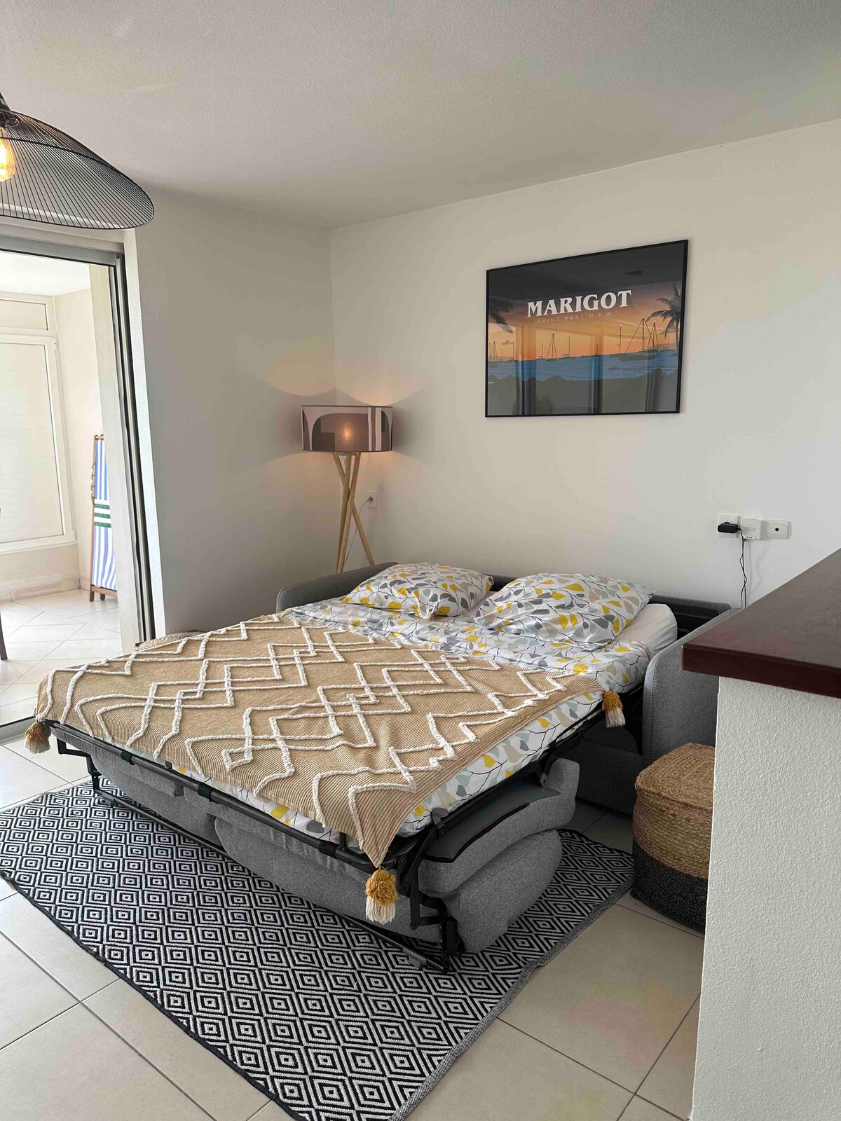Situé au N° 100D rue du cap ,dans une résidence calme et sécurisée, vous pourrez vous reposer dans ce petit T2, profiter de la terasse couverte, de la cuisine équipé. Il propose également une salle de bain assez spacieuse, une chambre cosy, ainsi qu'un petit salon composé d'un canapé convertible en lit offrant ainsi un second couchage. Vous pourrez si vous le souhaitez, marcher 10 minutes jusqu'à la plage de la Baie Orientale et son village composé de différents commerces et restaurants.