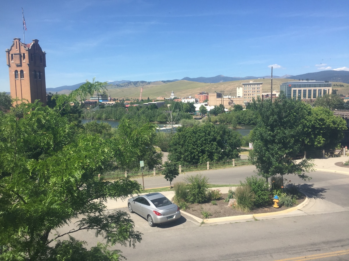 Diese obere Einzimmerwohnung mit LOFT ist der perfekte Zwischenstopp (1 Minute von der I-90 entfernt). Durchreisen oder bleiben, arbeiten und erkunden. Öffne die riesigen Glasschiebetüren zur Innenstadt von Missoula und den umliegenden Gebirgszügen. Nur wenige SCHRITTE von der Innenstadt, Einkaufsmöglichkeiten, Restaurants, Cafés, Bars + Brauereien, dem Clark Fork River, Musik + Sportstätten, Wandern, Radfahren entfernt. Möchtest du lieber drinnen bleiben? Genieße die voll ausgestattete Küche. Kaffee, TV, Internet und ein komfortabler Raum.