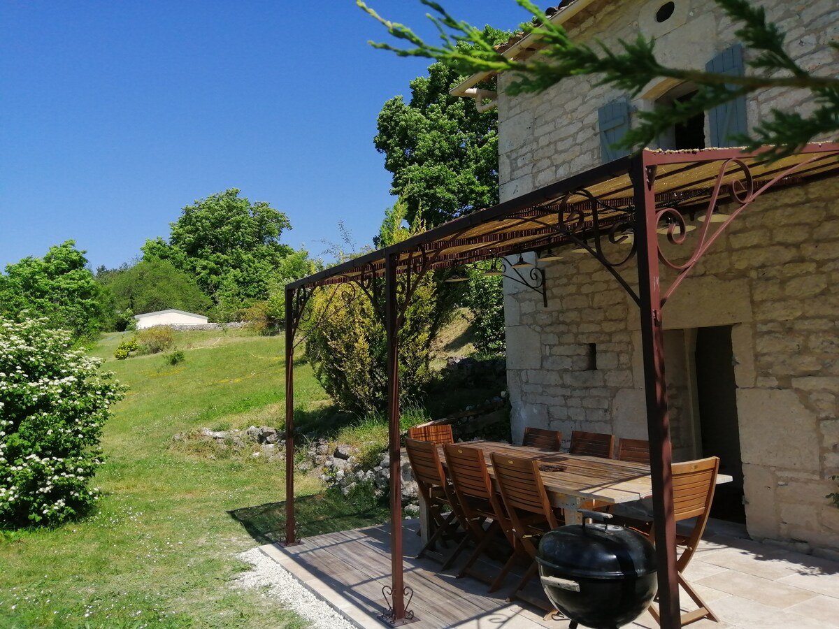 Venez séjourner en pleine nature, au coeur du Quercy, dans cette charmante demeure en pierres pouvant recevoir jusqu'à 8 pers. Charmante bâtisse de 100m2, cuisine équipée ouverte sur la grande pièce à vivre avec son poêle à bois. Terrasse de plein pieds de 60 m2 en pierres avec Spa extérieur ouvert d’avril à fin octobre Le gite est situé sur une hauteur en pleine nature, sans vis à vis. Vue imprenable sur les collines et la nature, grand parking privatif, non clôturé. Commerces à 5 et 10km