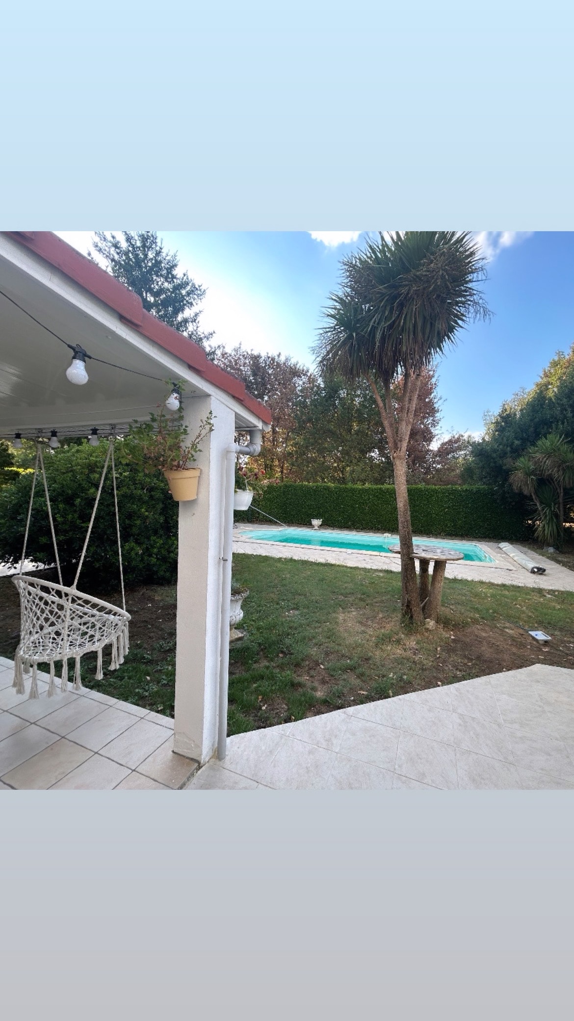 Haus in einer von Bäumen gesäumten Umgebung mit Pool und Fahrrädern