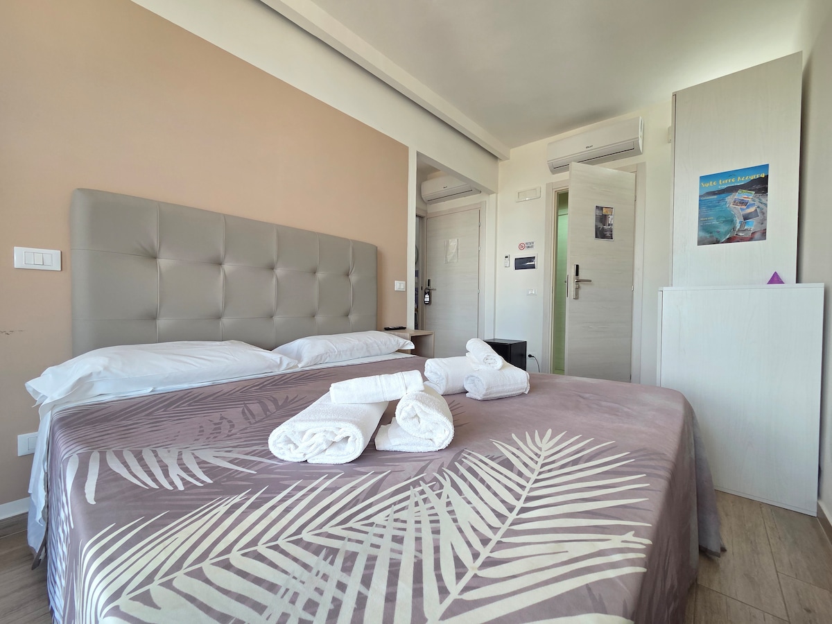 La camera è spaziosa e luminosa con ingresso indipendente e vista sul giardino. Negli anni abbiamo arricchito le camere con un piccolo angolo cottura (con lavandino, frigo, forno a microonde e macchinetta del caffè). All'esterno sono presenti tavoli e un solarium con lettini ed una cucina esterna.