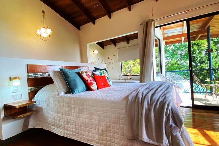 *** KOSTENLOSE WEINFLASCHE BEI BUCHUNG VON 2 NÄCHTEN ODER MEHR *** Willkommen im Ananta Forest – unserer wunderschönen Glamping-Kuppel im Nebelwald. Entspanne dich im Whirlpool, im Loft-Netz oder im Hängemattengarten, wo du einen atemberaubenden Blick auf den Sonnenuntergang, die Berge und den Golf genießen kannst. Ausgestattet mit 2 Kingsize-Betten, Panoramablick, Küche, Badezimmer und Highspeed-Internet hast du alles, was du brauchst, um einen unvergesslichen Urlaub zu gestalten. 5 Minuten zur Innenstadt 10 Minuten Abenteuerparks, Santa Elena Reserve 15 Minuten zum Monteverde-Reservat