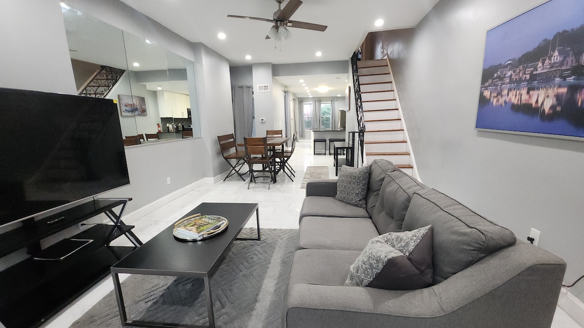 Beautifully renovated Philadelphia townhome providing an ideal space for family and friends to be together while exploring everything the city has to offer! A total of 2800 SqFt, 5 Bedrooms, 3.5 bathrooms, an outdoor patio, and free street parking! Location is in an up-and-coming neighborhood which is a short ride to all local attractions. Fully equipped kitchen and plenty of space for the group to relax. Perfect for family getaways, small groups, or traveling business partners who want space.