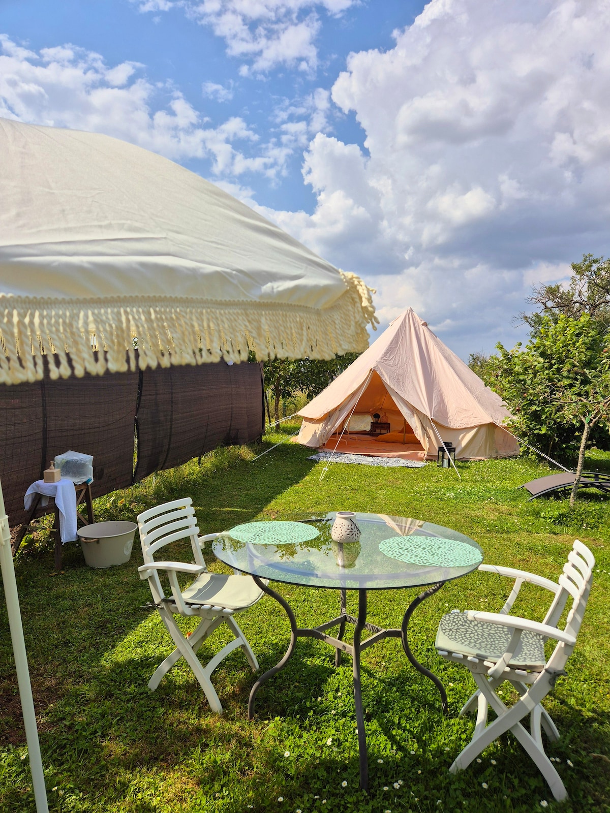 Durch das, was die einfachen Dinge am besten sind, ein böhmisches Leben...sei es für ein Familienessen am Tag oder um eine romantische Nacht im Glampingzelt zu verbringen, ist dieser Landgarten mit separatem Eingang und eigenem Spa für Ihre Glücksmomente gemacht! Tische, Stühle, Grill und Trampolin stehen zur Verfügung. Möglichkeit zum Frühstück, Aperitif und Massageservice und ästhetische Behandlungen auf Reservierung.
