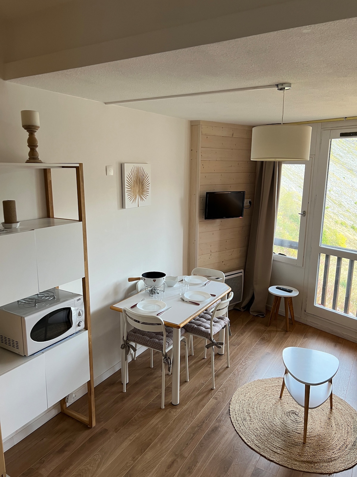 Lassen Sie Ihr Auto auf dem Parkplatz und genießen Sie den Ort zu Fuss! Neben einem öffentlichen SPA, dem Carrefour Montagne, den Skipisten in 100 m Entfernung gelegen, verfügt dieses ruhige, nach Süden ausgerichtete Nest von 30 m2 über einen Eingang/Skiraum, ein kleines Schlafzimmer mit einem Bett von 140 x 190 cm, Nachttisch, Kleiderschrank, eine Küche mit Geschirrspüler, Waschtrockner, Mikrowelle, Nespresso-Maschine, ein Wohnzimmer mit Sofa, WLAN, einen Smart-TV mit Netflix und Orange, einen Südwestbalkon, gemachte Betten.