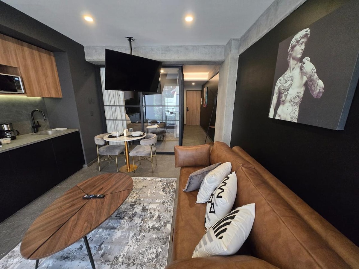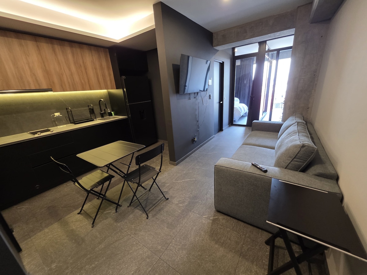 Schöne und neue Wohnung ganz in der Nähe des historischen Zentrums von Mexiko-Stadt. Die Wohnung verfügt über ein geräumiges Schlafzimmer (Kingsize-Bett), ein komplettes Badezimmer, einen Smart-TV im Schlafzimmer und im Wohnbereich. Das Sofa im Wohnzimmer kann zu einem kleinen Schlafsofa umfunktioniert werden, das perfekt für ein Kind ist. Sie verfügt über eine voll ausgestattete Küche mit hochwertigen Geräten. Das Gebäude bietet luxuriöse Annehmlichkeiten: einen Swimmingpool, einen Fitnessraum, einen Arbeitsbereich und unglaubliche Terrassen, auf denen du einen Panoramablick auf die Stadt genießen kannst.