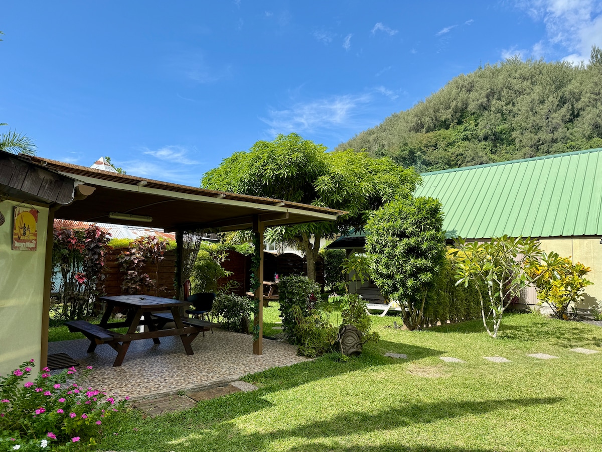 Formule LOGEMENT + VOITURE automatique ! Pratique et économique. Venez poser vos valises dans mon bungalow chic et rustique à l'entrée de la Baie de Cook. Détendez vous et profitez des plus beaux couchers de soleil, admirez les bateaux de croisière, le balai des pirogues et la danse des baleines. A proximité immédiate du centre de Moorea et de ses activités, vous disposez d'une voiture pour votre autonomie.