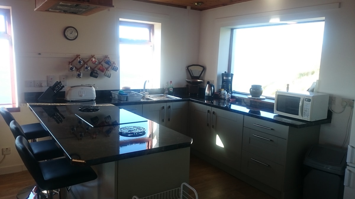 Next to the Claymore Restaurant - Claymore House offers panoramic ocean views over Broadford Bay, towards Applecross and the Crowlins. the house consists of two upstairs en suite double rooms, offering uninterrupted Atlantic views. A further ground level ensuite double room with patio doors leading out into the garden. Ground floor open plan kitchen dining lounge with a separate laundry room and bathroom. Fully equipped and very comfortable for upto six adults