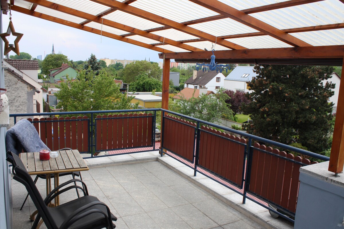 Neue luxuriöse Maisonette-Wohnung 12 mit neuer großer Terrasse, Blick auf Olomouc und Massagebad. Die Wohnung befindet sich in der Nähe des Zentrums .. direkt neben dem Flora Park. Öffentliche Verkehrsmittel Haltestelle Wolkerova und Penny Markt 100 m. Im unteren Stock befindet sich ein Badezimmer mit einer Massagebadewanne, ein Wohnzimmer mit einer Küche . Im zweiten Stock befindet sich ein gemütliches Schlafzimmer mit einem elektrischen Kamin. Der Nachteil ist die 5. Etage ohne Aufzug ..