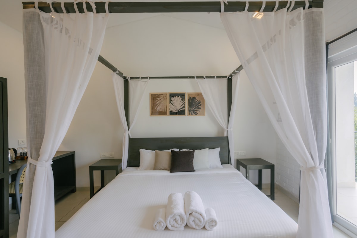 Your perfect beachside escape in Vagator awaits, ready to fill your heart with peace and unforgettable memories. 270 ft² / 25 m² private room 3 min walk to Vagator Beach ☞ Walk Score 99 (walk to Vagator Beach,chapora fort, cafes, dining, night clubs) ☞ Swimming pool ☞ Private balcony ★" Excellent location — close to beach & restaurants" ☞ Dimmable lights ☞ High-speed WiFi ☞ Parking On-site ★ “The interior were great and gave such a cozy vibe” ★"It's located quite close to the beach".