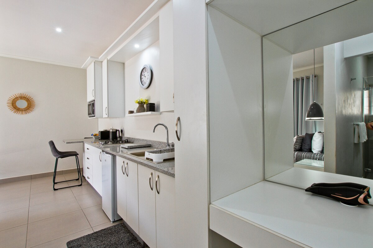 Erleben Sie modernen, stilvollen Komfort in unserer 56 m² großen Wohnung mit einem Schlafzimmer und einem Badezimmer in Bryanston. Die Wohnung bietet Platz für bis zu zwei Gäste und verfügt über ein Schlafzimmer mit einem Queensize-Bett, ein Badezimmer mit begehbarer Dusche, einen offenen Wohn- und Essbereich, eine Klimaanlage und einen kleinen Balkon. Die voll ausgestattete Designerküche ermöglicht eine mühelose Selbstverpflegung, Smart-TV mit Zugang zu Netflix, DSTV, Showmax und Amazon Prime Video (eigener Log-in).