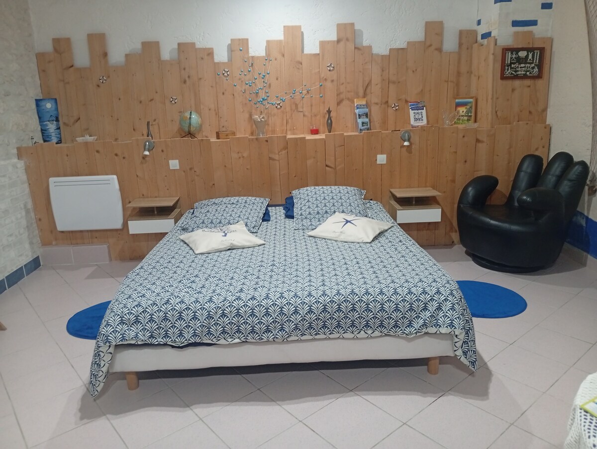 Alte Scheune, die in einem klimatisierten Zimmer von mehr als 30 m² in Saint-Germain-de-Lusignan in ruhiger und sicherer Lage saniert wurde. 3 km vom Gewerbegebiet von Jonzac, 5 km von der Thermalkur und 6 km vom Wasser- und Fitnesszentrum "Les Antilles" entfernt. Die ersten Strände sind 45 Minuten entfernt. Kostenlose Parkplätze vor Ort. Keine Küche in der Unterkunft.