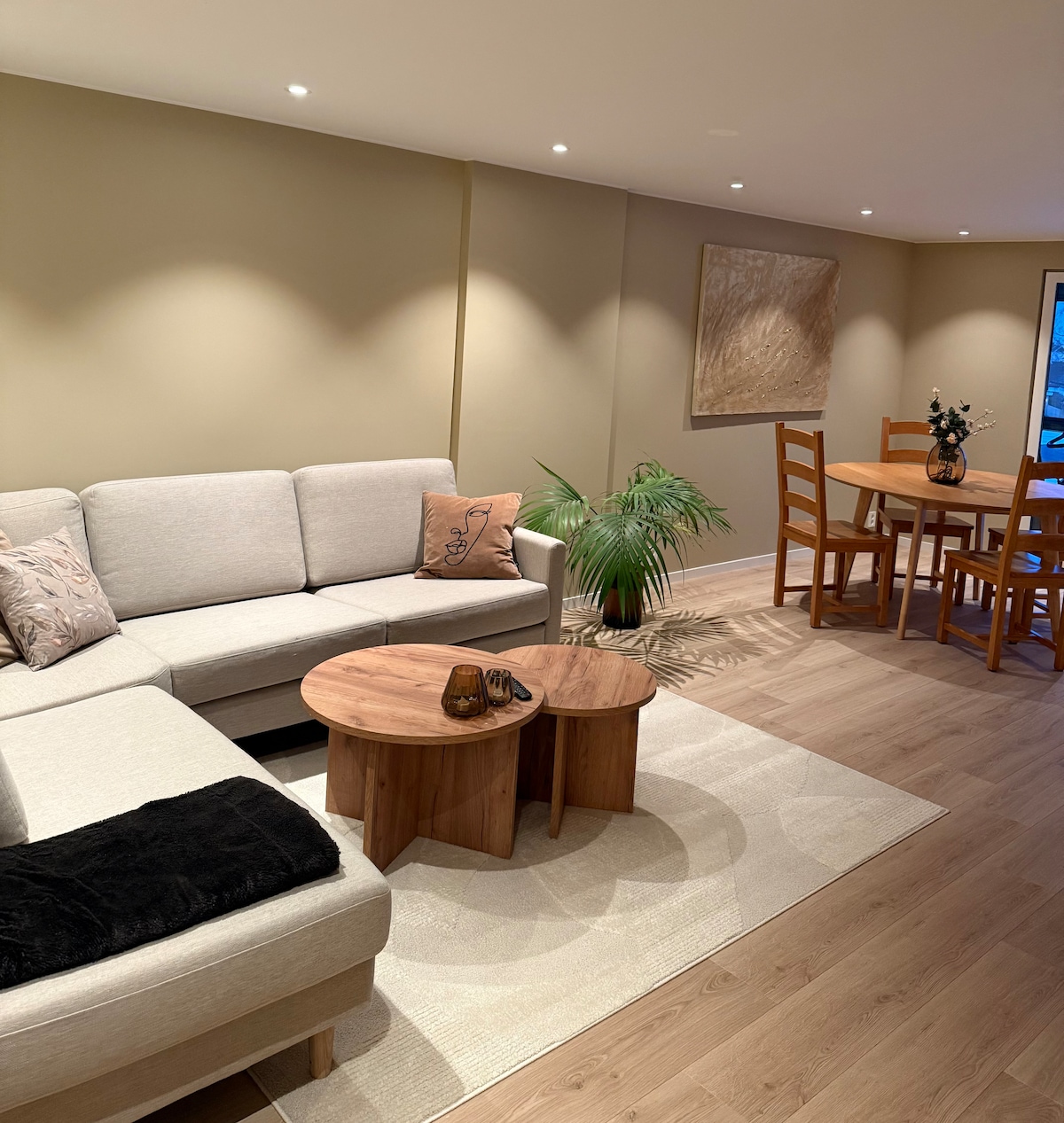 Übernachten Sie in einer hellen, modernen Wohnung mit privatem Garten und sonniger Terrasse – nur wenige Schritte vom Meer entfernt! Genieße das ruhige Fuglevik mit Stränden, Küstenwanderungen und einem Kiosk, der Eis, Bier und Essen anbietet. Die Wohnung verfügt über eine voll ausgestattete Küche, einen Essbereich, ein bequemes Bett und ein stilvolles Badezimmer mit Waschmaschine und Trockner. Parkplatz direkt vor der Tür – Platz für ein Wohnmobil.