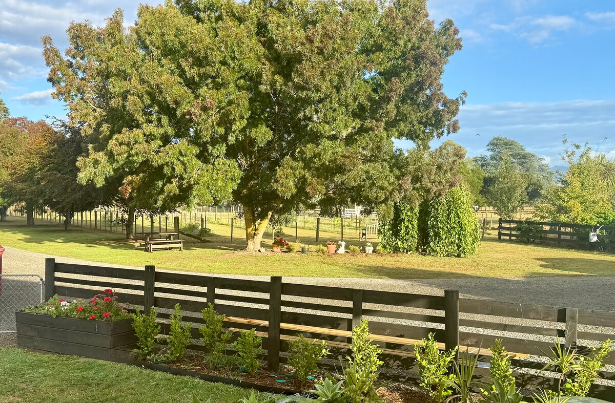 Entspanne dich 10 Minuten von der Stadt entfernt in einem charmanten Landhaus mit allen modernen Annehmlichkeiten. Nah genug an Annehmlichkeiten, um die Stadt zu erkunden, aber ruhig genug, um die Tui, Kereru und Ruru (Schleiereulen) in der Nacht zu sehen und zu hören. Es gibt einen Bach, der durch den unteren Paddock verläuft, damit Kinder darin planschen oder nach Aalen suchen können, während du die Sonne auf der Terrasse genießt. Es ist ein toller Ort für einen romantischen Kurzurlaub oder einen Familienurlaub auf dem Land. Es gibt viele Spaziergänge, Tiere zu sehen und die Ruhe ist unschlagbar.