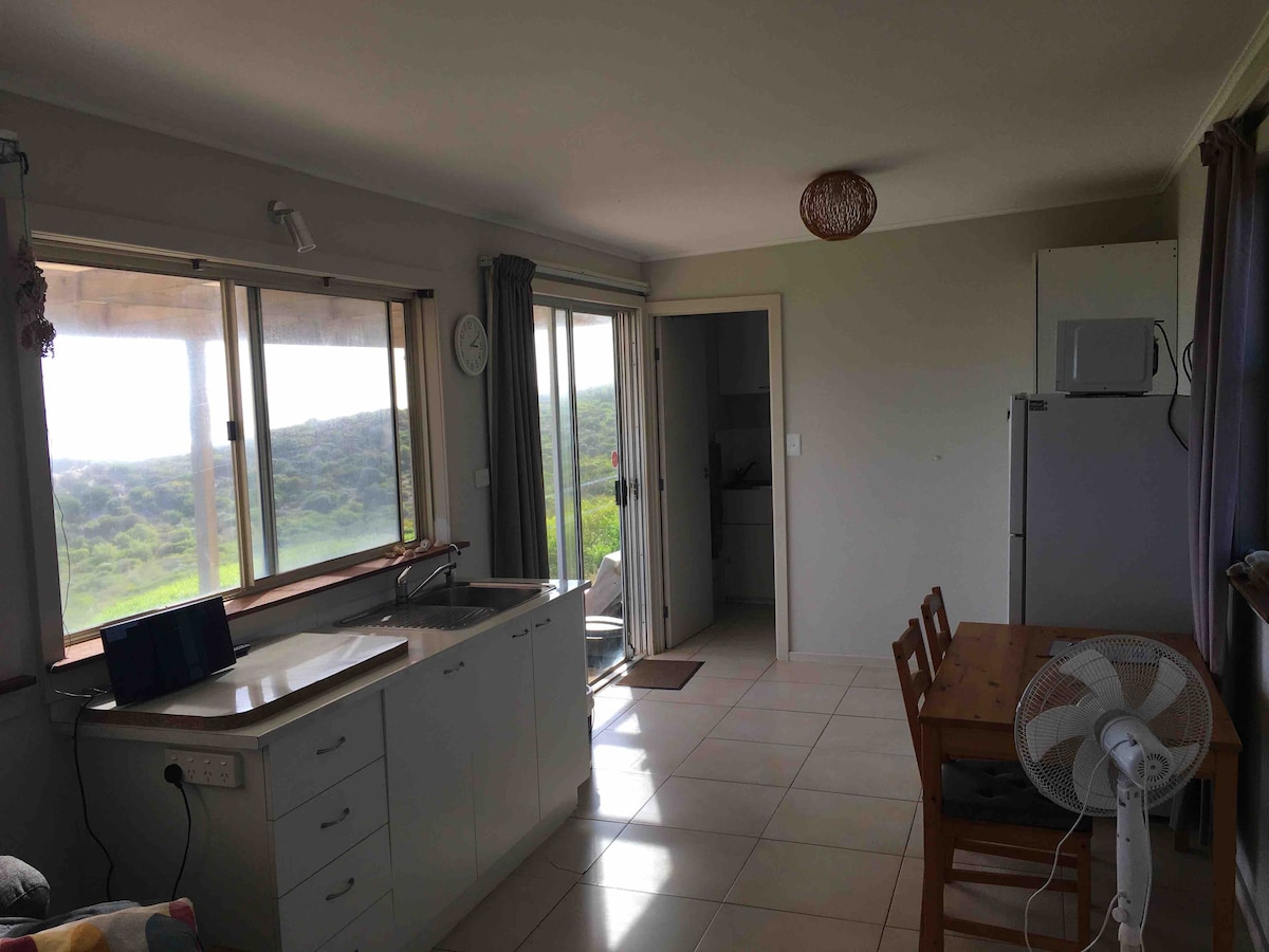 Die Unterkunft befindet sich am „Rand“ der schönen Moresby Ranges – genieße die atemberaubenden Sonnenuntergänge und den Meerblick von deinem privaten Außenbereich aus. Deine Unterkunft ist eine separate, komfortable, eigenständige Kalksteinvilla (ca. 15 m vom Haupthaus entfernt), inmitten einer ruhigen und friedlichen Umgebung, mit einer Fülle von Vogelleben in einem natürlichen Lebensraum. Der tolle Feuerstellenbereich ist ideal, um sich (saisonal) zu treffen und sich zu unterhalten... Hinweis – Auf Anfrage kann ein Aufenthalt von einer Nacht verfügbar sein.
