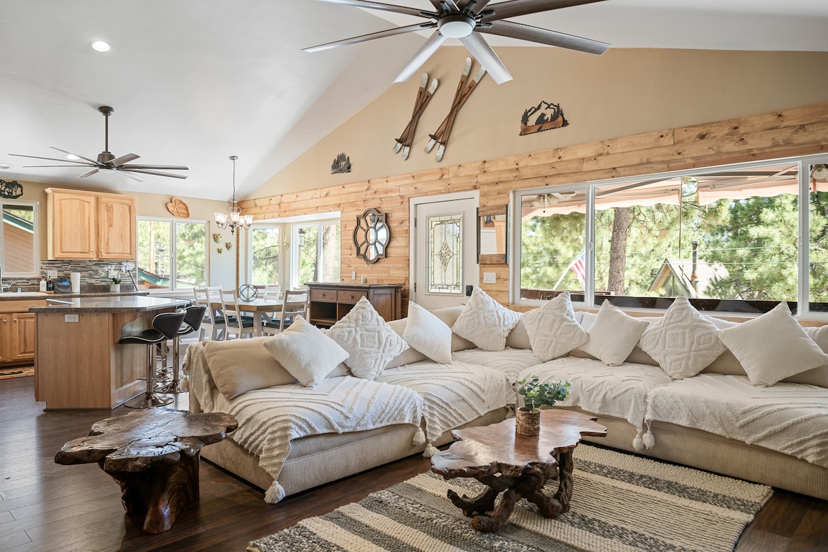 Summit Creek Pines is a recently renovated Big Bear cabin offering modern comfort in a serene neighborhood. It’s within walking distance to the lake, a local park, and ideal for watching the 4th of July fireworks. The home features an open-plan living area with a cozy electric fireplace, a gourmet kitchen, and a fenced backyard with a hot tub. Enjoy a game room, spacious bedrooms with TVs, and convenient amenities like WiFi, parking, and laundry.