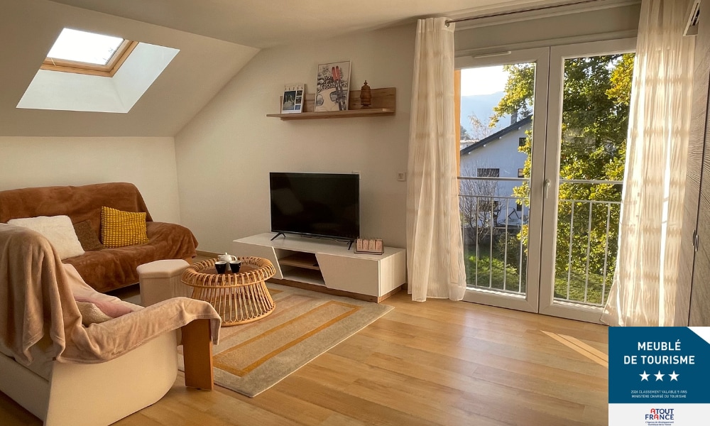 Joli appartement de 35 m2 refais à neuf dans une résidence avec vue sur la dent du chat. Situé à 5 minutes à pied de la gare d’Aix les bains et tout proche du centre ville. Le charme de ce logement chalet vous séduira à coup sûr. Dans ce logement vous bénéficier d’un sauna privatif, d’une belle cuisine équipée, un lit en 160, d’une télévision avec petit coin salon. D’une magnifique salle de bain avec douche à l’italienne.