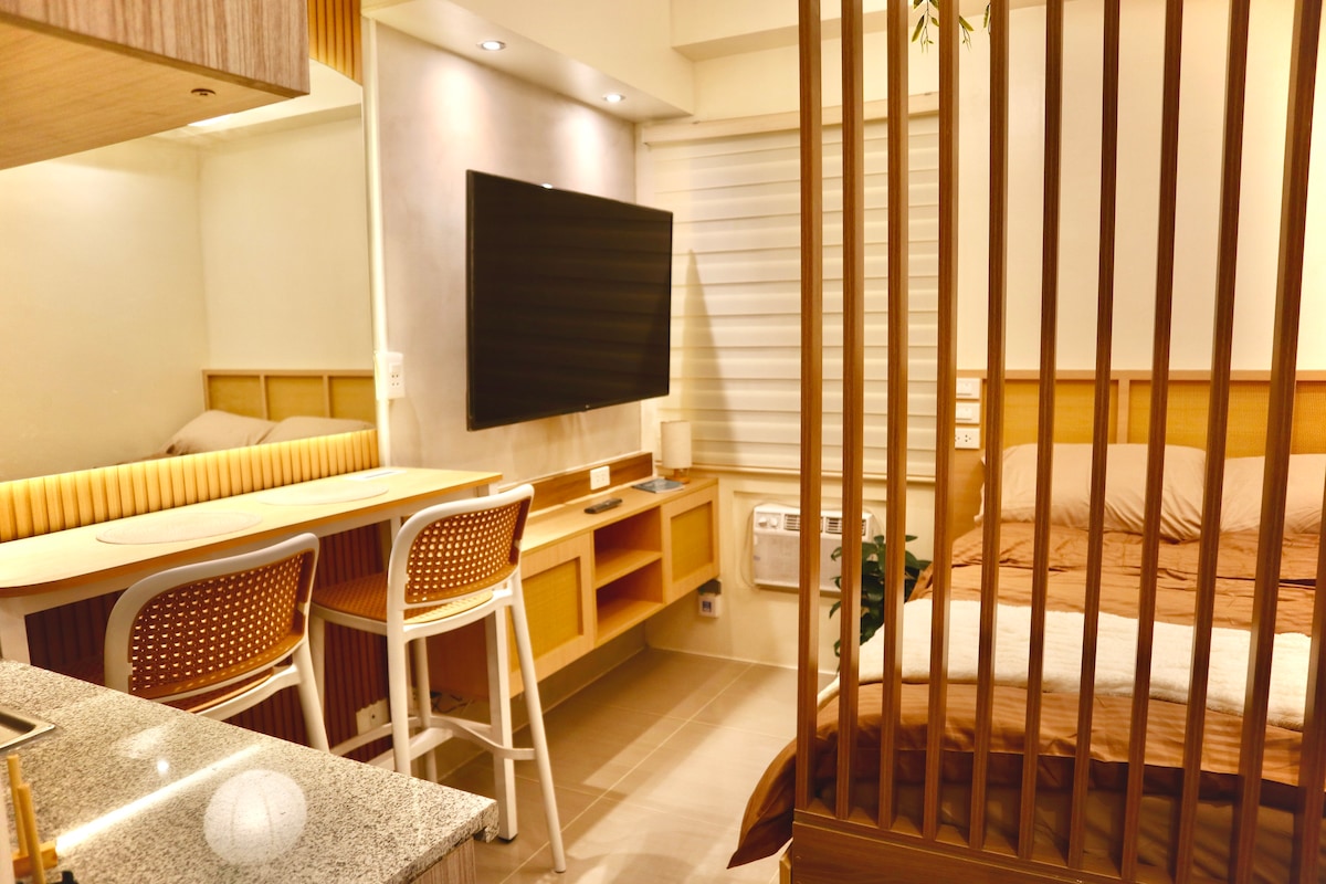 Gemütliches Studio-Zimmer Zugang zu WLAN, Netflix, Disney+, Amazon Prime Küchenausstattung wird bereitgestellt. Bett- und Badzubehör vorhanden. Warme und kalte Dusche Erstaunlicher Bergblick (Blick auf Antipolo-Gebiet) Zugang zum Swimmingpool ** Bitte beachte, dass du dich zuerst mit dem Lobby-Personal über Zeitpläne und Richtlinien abstimmen musst, bevor du die Annehmlichkeiten nutzt. ** Der Pool ist jeden Montag geschlossen.