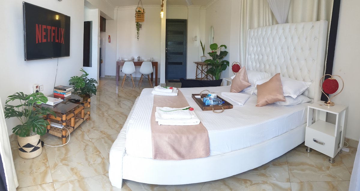 Ideal für Kurzzeitaufenthalte in der Küstenstadt Mombasa, Kenia 🇰🇪 Die Studio-Wohnung bietet höchste Gelassenheit. Du kannst einen Blick auf die ferne Meereslinie durch das Fenster mit einer besseren Aussicht auf dem Dach erhaschen. Ob im Urlaub oder auf Geschäftsreise oder beides, es ist günstig gelegen und leicht zugänglich mit ausreichend Parkplätzen. Die Wohnung befindet sich in der Nähe von Kenias 🇰🇪 erstklassigen Strandhotels 🏨 in der Gegend von Shanzu. Es ist nur wenige Gehminuten (500 Meter) vom Strand ⛱️ und dem blauen Himmel und Meer entfernt. 🌊
