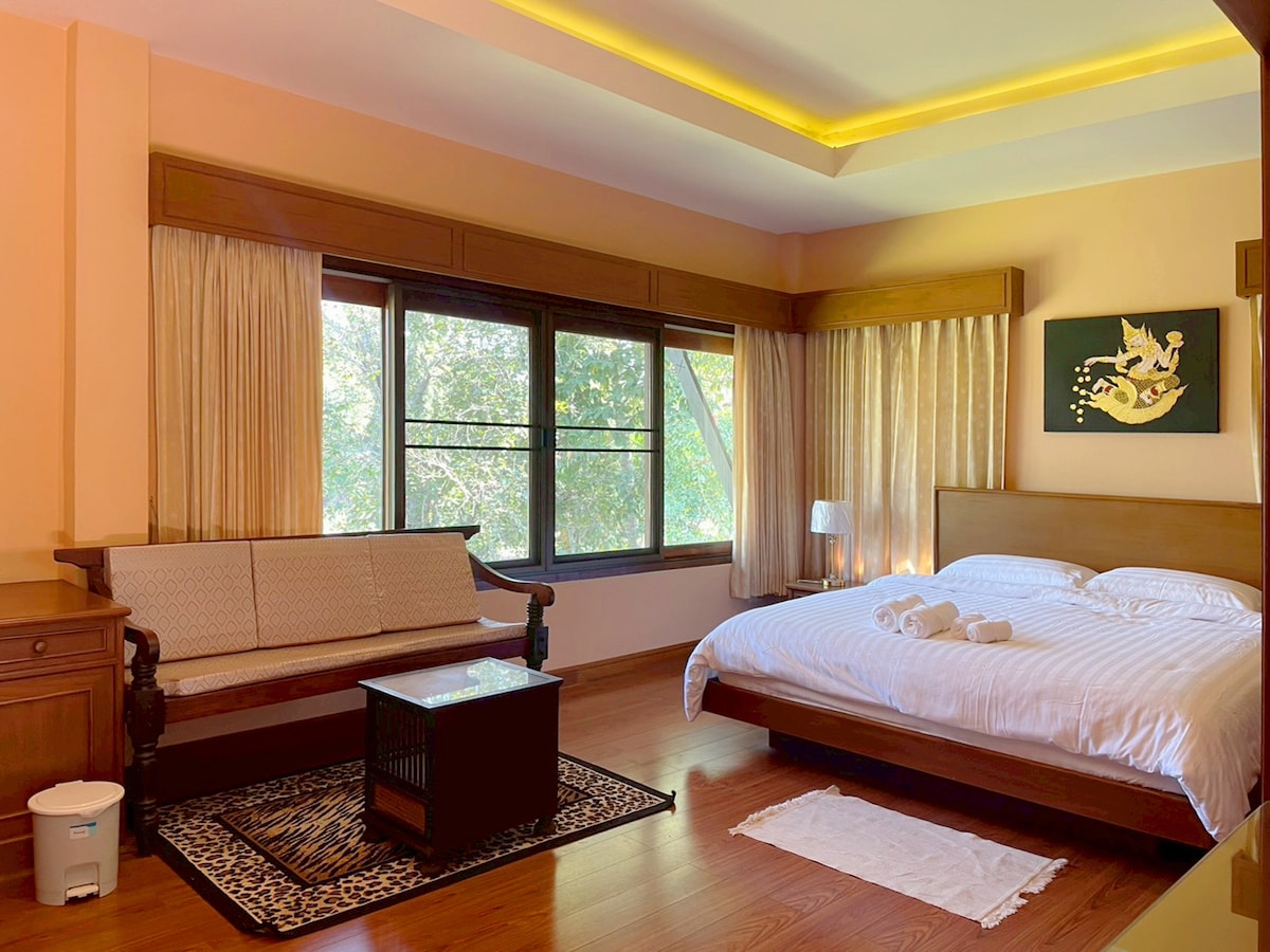 "A peaceful riverside retreat in warm Lanna Thai style" Baan Tarn Wana is a relaxing nature retreat located by the river, surrounded by green gardens. The atmosphere is quiet, private, and peaceful The house features traditional Thai-inspired architecture with wide, open-air balconies that allow natural light and fresh air to flow through. There is a spacious common area where guests can relax, or even work in a calm and comfortable environment.