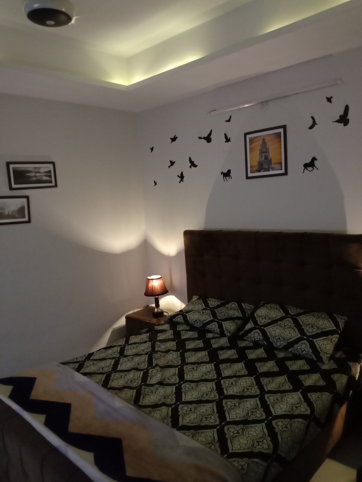 A luxury ground floor private unit of a 12 Marla house in the heart of Islamabad, it features 2 king-size bedrooms, a cozy TV lounge with 55 " TV, 100 Mbps Wi-Fi, a fully equipped kitchen, a dining area, 2 bathrooms, a patio. private entrance and a private parking. A Peaceful, green neighbourhood - Your Ideal home away from home Location Distance by car: I-8 Markaz: 3 mins Shifa Hospital: 4 mins. Airport: 35 mins. Motorway: 15 mins General Stores: 1 min Centaurs Mall: 10 mins F-6: 15 mins