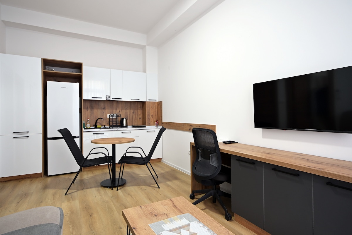 A newly renovated apartment in the heart of Veles, designed with care and simplicity. The interior is contemporary, calm and functional, with a bright living area and a fully equipped kitchen. Ideal for one person or a couple, it can comfortably host up to four guests. Located in a quiet central neighborhood, within walking distance to cafés, shops, and main streets. As an architect, I can also offer a short architectural walk for a deeper city experience.