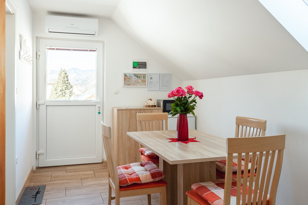 Eine perfekte geräumige Unterkunft für einen angenehmen Aufenthalt in der Gegend von Bled. Eine sehr saubere Wohnung befindet sich im Dorf Breg, 12 Fahrminuten vom Bleder See entfernt. Mit dem Fahrrad schaffst du es in 20 Minuten. Die Wohnung befindet sich im ersten Stock und wurde 2011 renoviert. Der Wohnbereich ist komfortabel, 72 Quadratmeter, Terrasse 15 Quadratmeter plus 15 Quadratmeter Balkon. Sie ist wirklich groß und komfortabel für 4 Personen. Sie verfügt über Highspeed-WLAN, Kabel-TV, einen DVD-Player und einen Kamin für ein schönes Winterambiente.