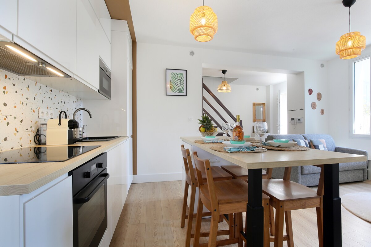 Le charme de la campagne à la ville au coeur de Toulouse quartier "Guilheméry" proche Cité de l 'Espace. Maison climatisée de 80m2 réservée aux voyageurs. Ideal Télétravail. Equipement pour 4 personnes, 2 chambres spacieuses salon, cuisine entièrement équipée. WC séparé. A l'extérieur vous profiterez d'une terrasse d'été avec barbecue. La salle de sport et la piscine sécurisée exclusivement aux voyageurs. Garage et 4 places de parking fermés A proximité commerces et transports en commun.