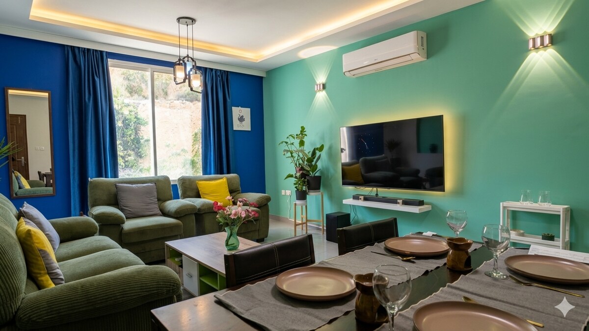Hosted by a Superhost, this modern 1-bedroom apartment at Al Mouj (The Wave), Muscat, offers a panoramic view of the entire Al Mouj community, Muscat airport, and marina. Just a 5-minute walk to the promenade, restaurants, and marina, this peaceful retreat is quieter and more luxurious than hotel—perfect for couples or solo travelers seeking unmatched comfort, style, and tranquility Enjoy breathtaking scenery, complete privacy, a truly relaxing atmosphere, and a private underground parking space