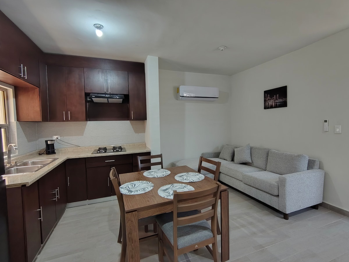 *WIR BERECHNEN BEREITS* Mini-Wohnung im Norden der Stadt, in einer sehr sicheren Wohnsiedlung. In der Nähe von Galerien, Krankenhaus Muguerza, UANE, TEC DE MONTERREY, AVEMED, MEDICA BOSCO, Kinos, Einkaufszentren, Restaurants und Bars. Genießen Sie einen Raum mit Esstheke, Mikrowelle, Minibar. 50-Zoll-Fernseher mit allen Streaming-Diensten Netflix, HBO, Star+, Disney+, Paramount+, High-Speed-WLAN.