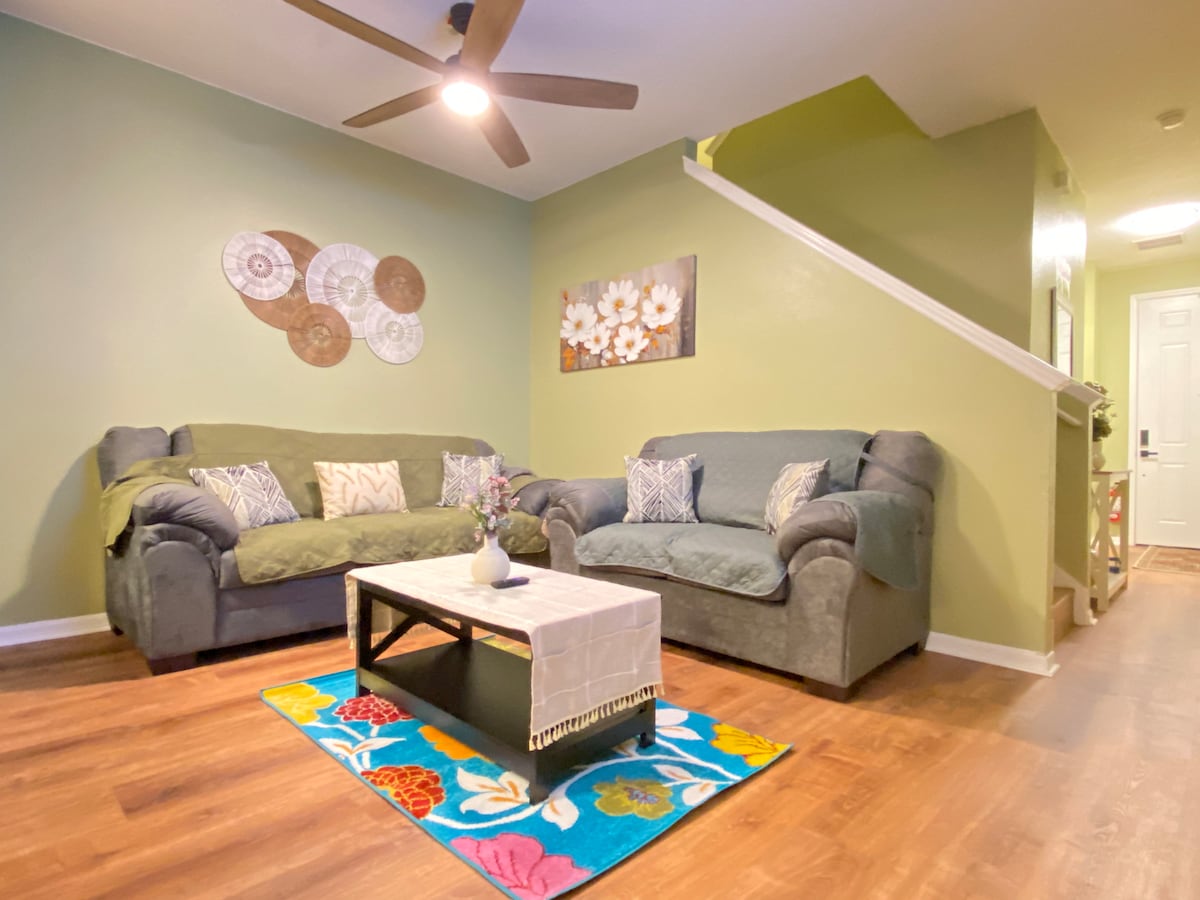 Gäste können die gesamte Unterkunft mit Ausnahme der Garage nutzen. Einfacher Zugang mit einem Zugangscode. Reihenhaus mit zwei Schlafzimmern, WLAN, Netflix, 50 Zoll und 32-Zoll-Fernseher, Waschmaschine und Trockner. 2,5 Bäder. Gemütliches Wohnzimmer und offene Küche. Badetücher inklusive. Praktisch ausgestattete Küche mit : Geschirrspüler, Backofen, Mikrowelle, Kiuerig Kühlschrank, Töpfe, Pfannen und Kochbekleidung. Brauchst du während deines Aufenthalts Babyausrüstung? Miete Kinderbetten, Autositze, Kinderwagen, Spielzeug und mehr von BabyQuip! Wie auf Shark Tank zu sehen, bietet BabyQuip in über 650+ Städten saubere, desinfizierte und sichere Babyausrüstung! Besuche https://www.babyquip.com/a/5gerhx, um eine Reservierung vorzunehmen. https://www.babyquip.com/a/5gerhx