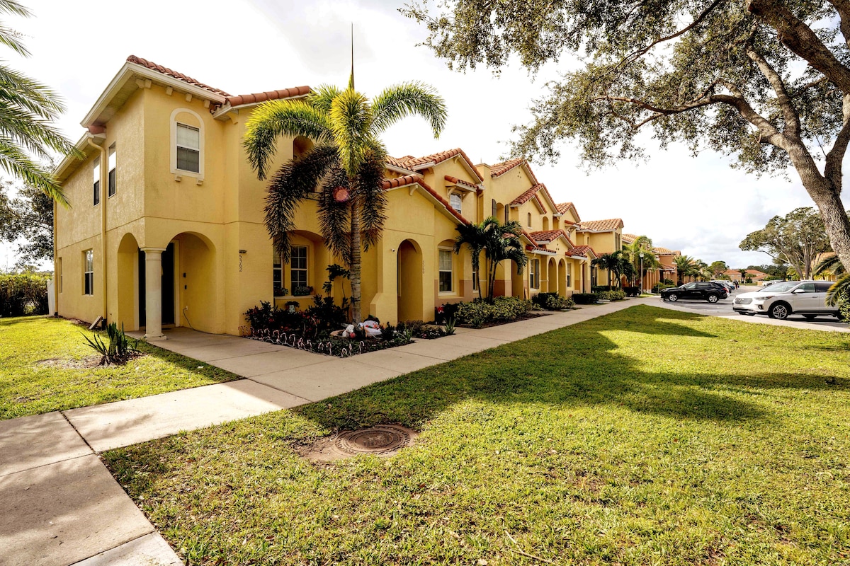 *HAUSTIER- UND KINDERFREUNDLICH* *Langzeitmieter willkommen* Reihenhaus mit 2 Schlafzimmern und 2,5 Bädern in einer geschlossenen Wohnanlage! 10 Minuten nach Disney, 20 nach Seaworld und 30 nach Universal Studios. Die Gemeinschaft verfügt über einen großen, schönen, beheizten Pool und einen Spielplatz/Grillplatz. Professionelle Reinigung nach jedem Aufenthalt. Voll ausgestattete Küche mit Keurig-Kaffee, sämtlichem Geschirr, Utensilien, Gewürzen usw. Alle Badezimmer sind voll ausgestattet mit Pflegeprodukten und vielen zusätzlichen Handtüchern. Die Terrasse verfügt über Stühle, einen Gasgrill und einen Sitzbereich.