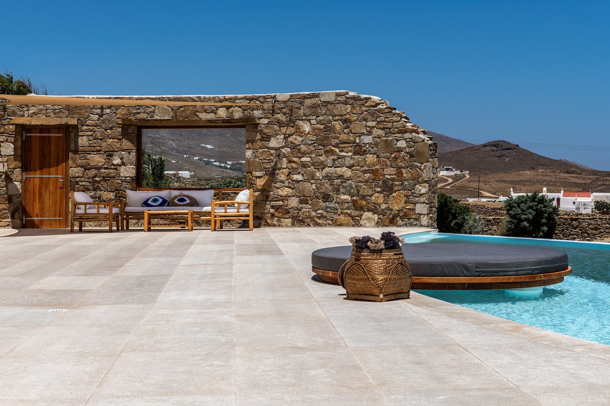 A stone courtyard and stucco archway set the scene for this classically inspired Mykonos villa. Centuries of Greek-islands architecture have influenced its mix of white walls and wood accents—and the sea views from the terrace are timeless—but its 2 pools with round sunbed and covered outdoor dining and bar are all modern, as is the open-plan layout inside. It’s minutes down to Ftelia Beach. Copyright © Luxury Retreats. All rights reserved. BEDROOM & BATHROOM • Bedroom 1 - Primary: King size bed, Ensuite bathroom with stand-alone rain shower, Walk-in closet, Television, Desk, Heating, Balcony • Bedroom 2: King size bed, Ensuite bathroom with stand-alone rain shower, Walk-in closet, Television, Desk, Heating, Balcony • Bedroom 3: King size bed, Ensuite bathroom with stand-alone rain shower, Walk-in closet, Television, Desk, Heating, Balcony • Bedroom 4: King size bed, Ensuite bathroom with stand-alone rain shower, Walk-in closet, Television, Heating, Terrace • Bedroom 5: King size bed, Ensuite bathroom with stand-alone rain shower, Walk-in closet, Television, Terrace OUTDOOR FEATURES • Outdoor sound system • Outdoor living space • More under “What this place offers” below STAFF & SERVICES Included: • Linen & towel change - every other day Extra Cost (advance notice may be required): • Activities and excursions • Babysitting service • Concierge service