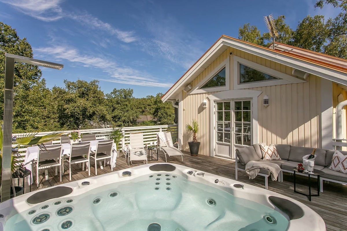 Charming, spacious, recently renovated and fully equipped exclusive 50's townhouse with 3 bedrooms. Located in a calm and posh suburb to Stockholm, you'll live on an island in the Stockholm archipelago. Conveniently located, it's only a 10-15 minute drive to downtown Stockholm. - Enjoy a barbecue on the terrace overviewing the lush yard - Refresh in the outdoor jacuzzi (summer) - Relax by the fireplace in the spacious living room - Avoid any bathroom queues as the house features two bathrooms