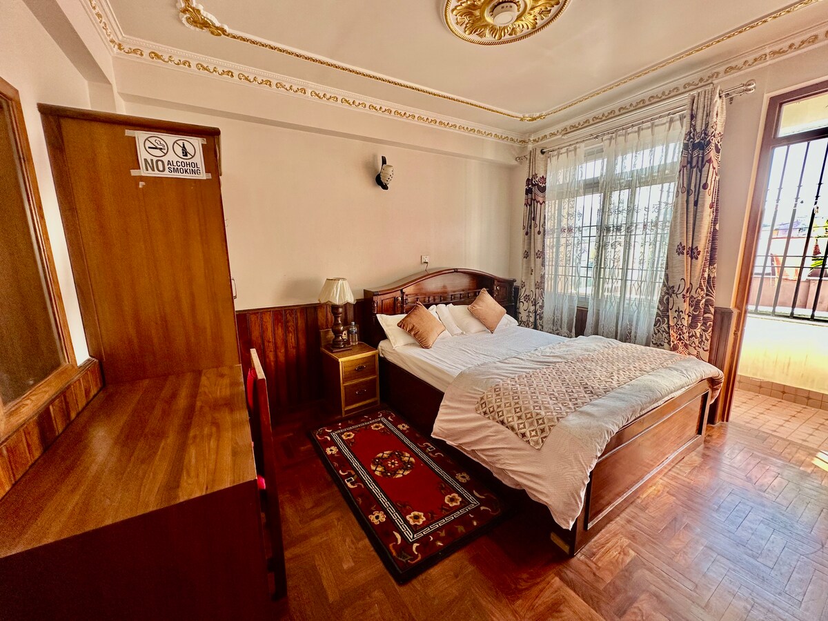 Award Winning Nepalese & Tibetan Designer Apartment is Traditional yet Contemporary. Lavish Tibetan Theme 1 Master bedroom with en-suite bathroom, located in a very tranquil location in Swoyambhu, which is very close to Thamel, Patan and Durbarmarg. The apartment is huge, covering 1500sq. ft with beautiful views of the hills, Swoyambhu Stupa and Kathmandu city. It has 1 bedroom, 1 bath, 1 living room, 1 kitchen, 1 living room with a huge private balcony. Please message to check availability.