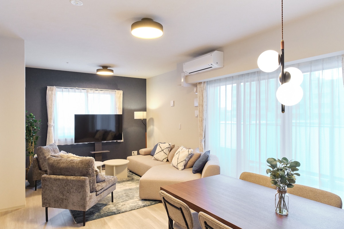 A modern apartment next to Nakajima Park, a peaceful green oasis in central Sapporo. The unit features 3 bedrooms and can host up to 9 guests. Bright living and dining areas provide a relaxing stay, with a functional kitchen and bathroom. Free parking for one car is available. Easy access to Susukino and Odori by subway or streetcar makes this an ideal base for sightseeing, dining, and seasonal events. Enjoy nature, culture, and comfort all in one place.