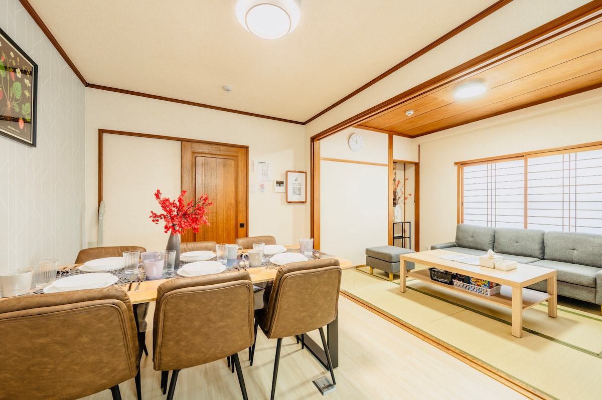 Dieses historische Haus aus dem Jahr 1909 befindet sich in Osakas Joto Ward und ist ein seltener Überlebender aus dem Zweiten Weltkrieg. Es wurde 2015 von einem renommierten Designer renoviert und erstreckt sich über 150° und verbindet historischen Charme mit modernem Luxus in einem ruhigen Rückzugsort im Stadtzentrum. Sein elegantes Design harmoniert Vergangenheit und Gegenwart und bietet kulturelles Eintauchen und geräumigen Komfort. Mit zwei Badezimmern, separaten Toiletten, Waschbecken und einer großen Badewanne sorgt es für Privatsphäre und Sauberkeit für Gruppen. Erlebe Kultur, Geschichte und Komfort, dein perfekter Aufenthalt in Osaka erwartet dich.