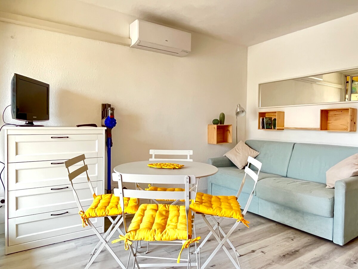 Cet appartement très lumineux, restauré, enregistré en Mairie . Vue panoramique sur la mer. Plage pavillon bleu depuis 1988. Appartement accueillant, tout équipé ( lit 160x200), occupation maximale 2 adultes, au dernier étage d'une petite résidence, proche des commerces, des restaurants. Ventilateur plafond + rafraîchisseur d’air. Abri de jardin avec 2 VTT +jeux de plage. Parking gratuit public devant le bâtiment. Fibre wifi dans l'appartement.