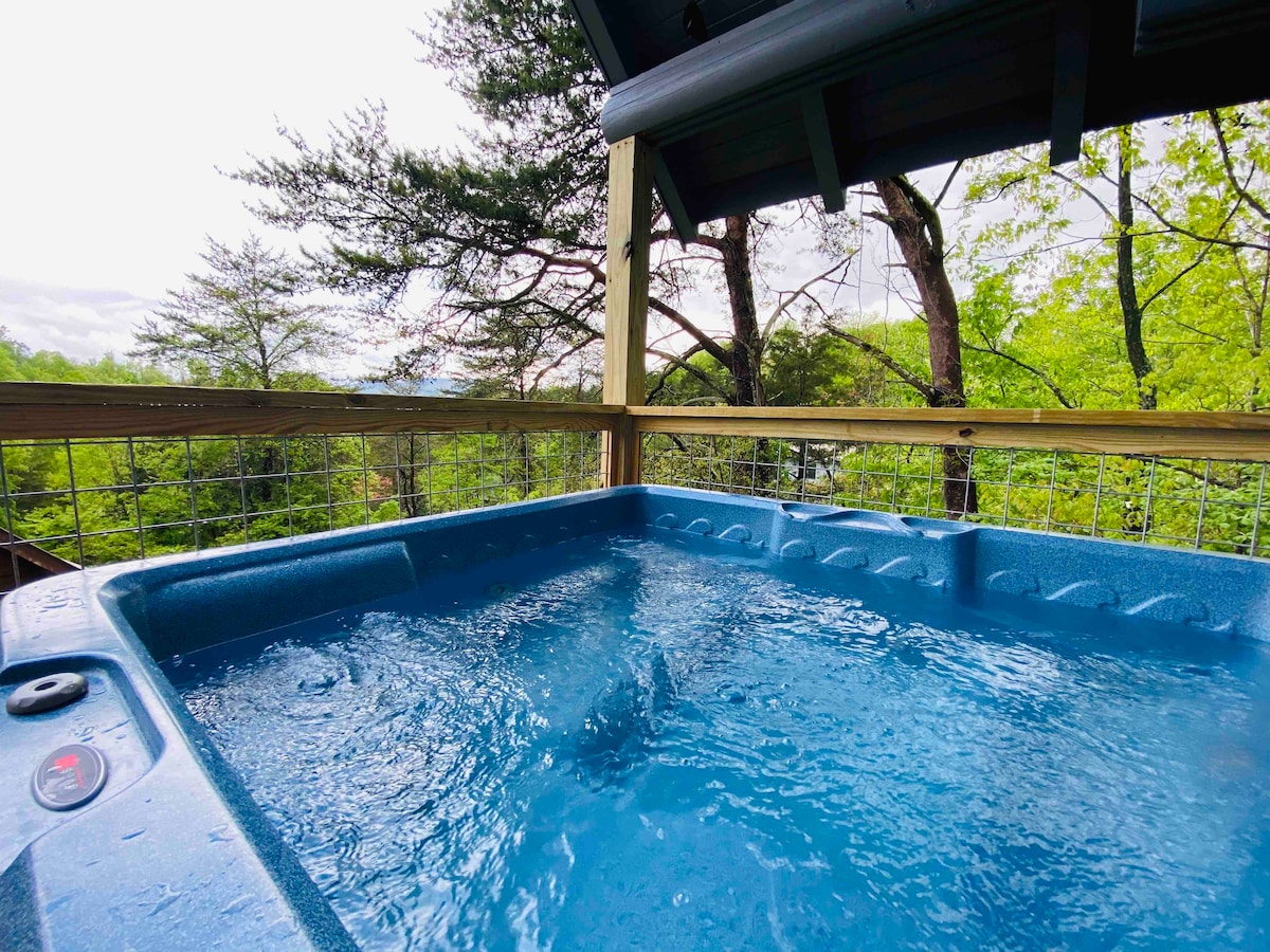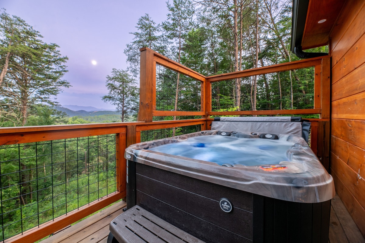 Dein elegantes Bergabenteuer erwartet dich! Avalon Ridge ist eine atemberaubende, private, moderne Hütte, hoch in den Smoky Mountains gelegen, mit unvergleichlicher Aussicht! Das geräumige Schlafzimmer verfügt über einen Steinkamin und eine luxuriöse Badewanne, das Waldloft ist von alten Harthölzern umgeben und raumhohe Fenster bieten einen Blick von überall in der Hütte! Genieße den Sonnenaufgang vom Frühstücksplatz aus oder entspanne dich bei einem luxuriösen Bad im privaten Whirlpool. Buche noch heute dieses Refugium auf dem Berggipfel!