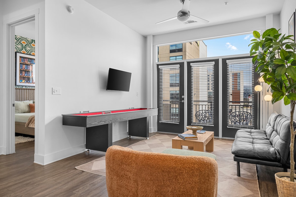 Tauche ein in das lebhafte Zentrum von Downtown Nashville mit The Burnham's Skyline Penthouse Apartment, nur zwei Blocks vom berühmten Lower Broadway entfernt. Dieser einzigartige Raum bietet einen atemberaubenden Blick auf die Skyline und eine umlaufende Terrasse mit raumhohen Fenstern, was dies zu einem wirklich einzigartigen Aufenthalt macht. Mach dich bereit für das ultimative Party-Erlebnis auf der obersten Etage in der Stadt – eine perfekte Umgebung, um dich und deine Gäste zu beherbergen!