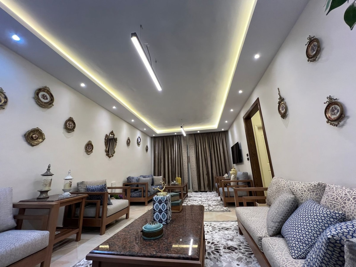 Welcome to my lovely Charming Luxury apartment! My Apartment located in Luxury safe Compound with very good wide Garden and Kids Area. Enjoy modern elegance 2 Bedroom , complete AC, and comfort. Stylish living area, fully equipped kitchen. You'll love the stylish décor and cozy atmosphere, which makes it the perfect home away from home. *High-speed internet. *10 mins to City Center Almaza Mall *15 mins Cairo Festival Mall *15 mins to Airport Book now for a delightful stay!