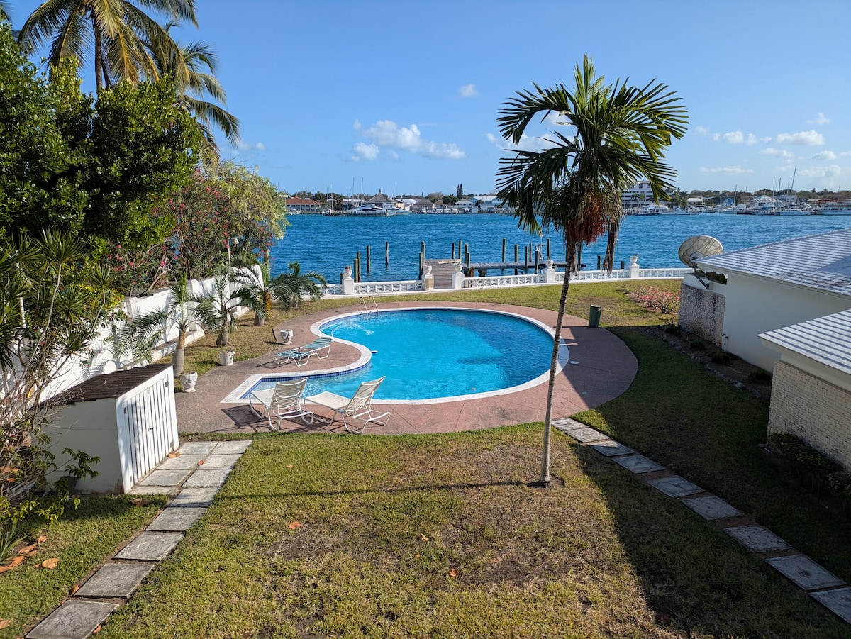 Located in the residential enclave of Skyline Heights, this home offers privacy and space in New Providence. It is known for its safety (being close to the British High Commission and other notable homes). Set on a full acre, the property includes the main house and 2 cottages at the far end of the grounds, occupied by long-term tenants. The only shared areas are the parking lot and the rear path. The cottages are not visible from the main house, and tenants do not have access to the pool.