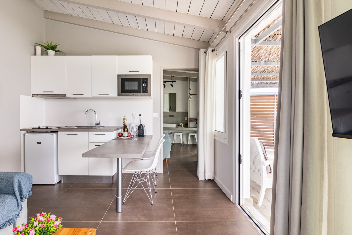 Meliti ist ein einstöckiges Ferienhaus, bestehend aus 1 Schlafzimmer mit Platz für 2 Gäste und einem eigenen Bad. Es bietet Platz für 1 zusätzlichen Gast auf dem Wohnzimmer-Schlafsofa oder maximal 2 Kinder. Das Haus bietet einen atemberaubenden Meerblick von allen Bereichen, vor allem der Blick vom Bett aus wird unvergesslich bleiben. Entspanne dich im gemütlichen Wohnzimmer, bereite das Abendessen vor oder entspanne dich in den Möbeln im Freien und genieße absolute Gelassenheit sowie das beruhigende Rauschen des Meeres.